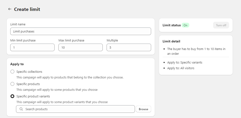 * **Specific product variants:** For each product variant, your customers can only purchase quantities within the specified range. &#x20;